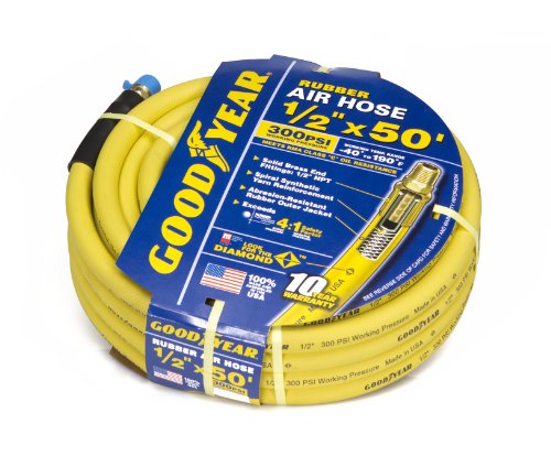 The Goodyear industrial-quality rubber air hose is strong, flexible and easily attaches to any air compressor. Features solid brass end fittings, spiral synthetic yarn reinforcement and abrasion-resistant rubber outer jacket. U.S.A. Max. PSI: 300, Hose Fitting Size (in. NPT): 1/2, Hose Application: Air, Material Type: Rubber, Hose Length (ft.): 50, Hose Diameter (in.): 1/2, Hose Temp Range (deg F): -40-190