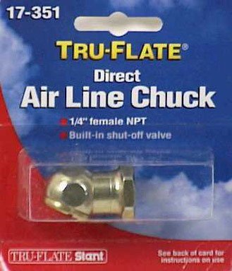 Direct air line chucks have a built-in shut-off valve and therefore cannot be used on inflator gauges. Use when air supply lines come directly from the compressor with no other valve in the line. 1/4" Female NPT and 150 PSI maximum air line pressure.