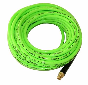 This hose is remarkable it is very strong, but light weight. It is fifty foot long, plenty of hose, for your workshop, or Garage. You can see this hose everywhere you go, because, it is fluorescent green. and is very sturdy and strong, it will not break into. And has a great price also. Ireccommene this hose.