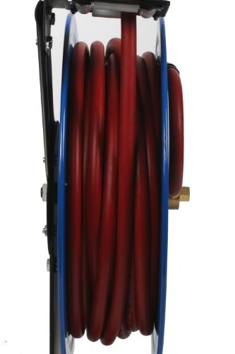 - Heavy duty base and reel mounts to any wall, ceiling, or work bench and holds 50' of 3/8" rubber hose