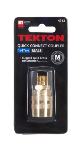 A must-have pneumatic air hose accessory, the TEKTON 1/4-Inch MNPT Quick Connect Male Coupler allows for simple, one-touch connecting and disconnecting of tools and accessories. Constructed from rugged, solid brass and precision-machined for a leak-proof operation. Fitting is 1/4-Inch NPT male-style couple and will fit female-style or industrial interchange quick connect plugs. The coupler has a 90 day guarantee.